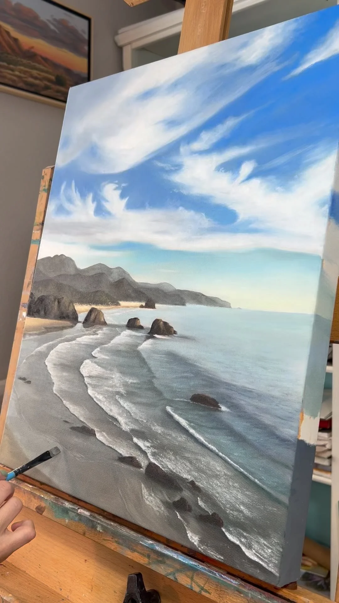 Danielle Conti is a contemporary landscape painter who primarily works in oil paints. She graduated from Arizona State University with a Bachelor of Arts in Art History and studied in Florence, Italy. She was born in Phoenix and currently lives and works out of her studio in Gilbert, Arizona. Danielle finds constant inspiration in nature, whether in the hot and dry desert of her native Arizona, or the moody Oregon Coast where she and her family often visit. She is endlessly fascinated by the play of light and clouds on the landscape and tries to capture that through her artwork.